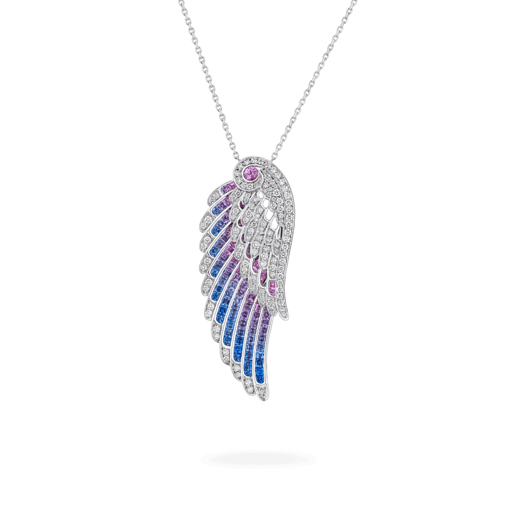 Wings Embrace Bird of Paradise Slider Pendant In 18ct White Gold with Diamonds and Sapphires