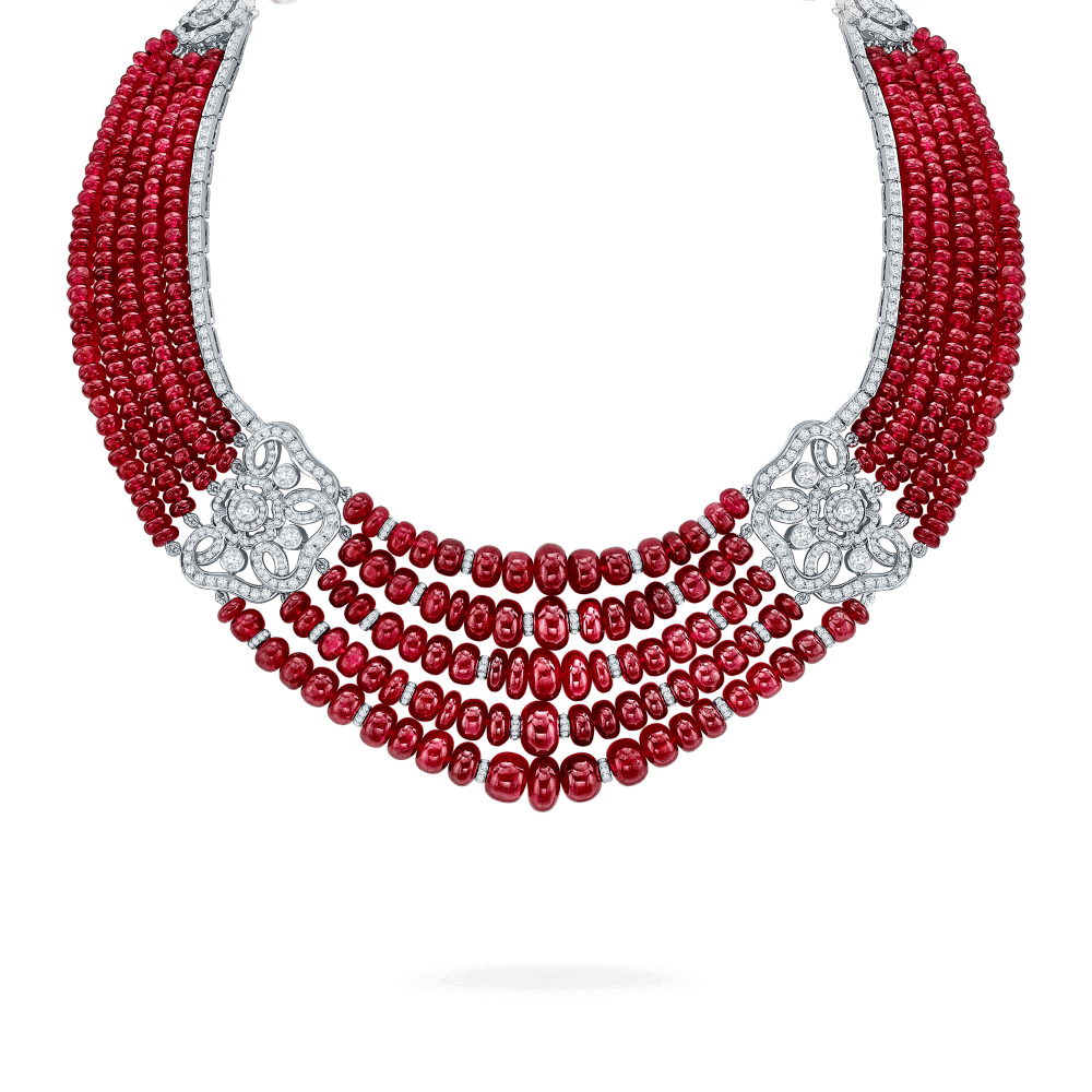 The opulent Red Rose high jewellery suite features hundreds of polished ruby beads that evoke the vibrancy of a red rose, juxtaposed with stylised diamond flowers with ruffled petals.